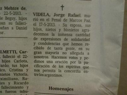 Nacionales | Lo hizo a través de la publicación de un aviso fúnebre en el Diario La Nación. Allí se destaca que las expresiones de dolor y tristeza por la muerte del genocida que fueron pronunciadas por personas "no allegadas a nosotros" y piden por la "pacificación de los espíritus"
