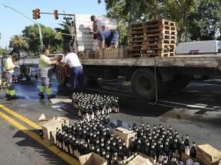 Nacionales | Un leve incidente de tránsito provocó esta mañana que un camión volcara su carga de varias cajas de fernet en la interseccción de Libertador y Montevideo, en la Ciudad Autónoma de Buenos Aires.