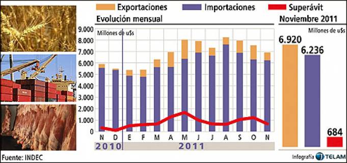 Nacionales | En noviembre mejoró sustancialmente, alcanzando los US$ 684 millones, 109% más que en 2010. Hubo una fuerte desaceleración de las importaciones por la mayor protección a la industria nacional. Siguen creciendo las exportaciones industriales.
