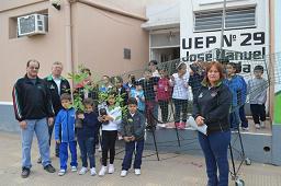 Locales | Ayer en horas de la mañana, la Secretaría de Medio Ambiente del Municipio de la ciudad de Villa Ángela, gestión Susana Simonofski, en la continuidad de acciones programadas en el desarrollo del Plan GIRSU (Gestión Integral de Residuos Sólidos Urbanos), realizó la entrega de plantines de árboles y acercó la botella gigante a la UEP Nº 29 José Manuel Estrada, para que los alumnos puedan realizar la recolección de botellas plásticas dentro de la institución.