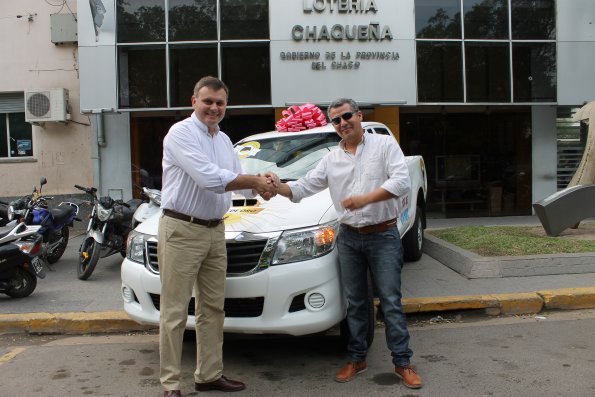 Claudio Olysinsky, un vecino de Resistencia que se desempeña como chófer en Casa de Gobierno, se llevó hoy la camioneta Toyota Hilux cero kilómetro que obtuvo durante el segundo sorteo del Gran Bingo de Oro de Lotería Chaqueña, que el próximo 11 de noviembre pondrá en juego un departamento a estrenar por un valor de 1.500.000 de pesos. El presidente de Lotería Chaqueña, Néstor Rolhaiser, fue el encargado de hacer entrega de las llaves del flamante vehículo a este ganador que expresó su alegría por haberse alzado con el máximo premio del sorteo efectuado el pasado 11 de octubre.