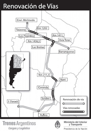 Locales | Entre febrero y abril del próximo año, según las previsiones anunciadas por el jefe de Gabinete de Ministros Jorge Capitanich, podría observarse el avance a buen ritmo de las obras de sustitución de las vías antiguas por las nuevas en la traza ferroviaria del Belgrano Cargas, un tren estratégico para la logística de transporte de cargas de las economías regionales del norte argentino. El adelanto dado por el gobernador chaqueño en uso de licencia- fue complementado con un nuevo mapa que muestra los tramos de vías ya renovadas y otros que atraviesan distintas etapas en la ejecución.