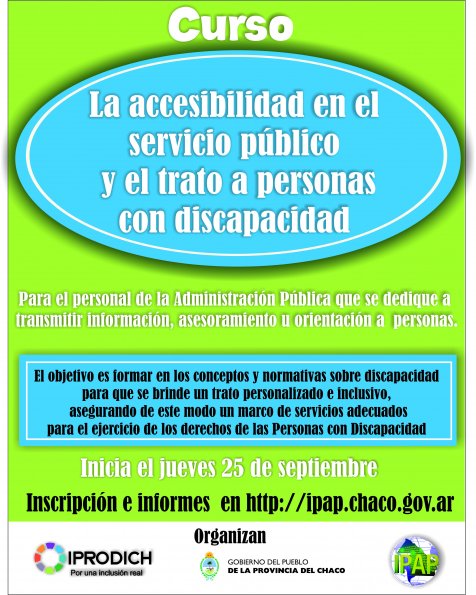 Locales | El próximo jueves comienza el curso “La Accesibilidad en el servicio público y el trato a personas con discapacidad”, destinado trabajadores del estado provincial. La capacitación es organizada por el Instituto Provincial para la Inclusión de las Personas con Discapacidad del Chaco (Iprodich) y el Instituto Provincial de la Administración Pública (IPAP). La inscripción ya está abierta.