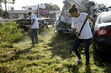 Locales | Como parte de las acciones de saneamiento ambiental que se llevan a cabo mediante el programa nacional Argentina Trabaja, cooperativistas encaran tareas de desmalezamiento y limpieza integral en la comisaría Seccional Cuarta de Resistencia.
