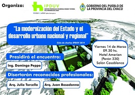 Locales | El Instituto Provincial de Desarrollo Urbano y Vivienda -IPDUV- llevará adelante este viernes 14 de marzo la jornada “La Modernización del Estado y el Desarrollo Urbano Regional y Nacional" en el Salón Casablanca del Hotel Amerian de Resistencia.