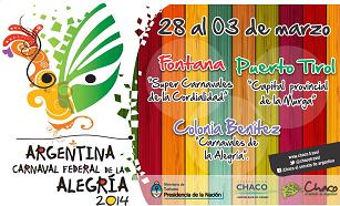 Locales | En el marco de los feriados de carnavales, el Ministerio de Turismo de la Nación impulsa la edición 2014 de los carnavales Federales de la Alegría que comprenden en la provincia los corsos de Fontana, Colonia Benítez y Puerto Tirol.