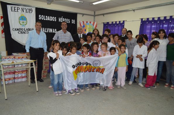Locales | Directivos de Lotería Chaqueña y Telekino concretaron la entrega de una tonelada de alimentos para el comedor de la Escuela de Educación Primaria Nº 1019 “Soldados Héroes de Malvinas” de Campo Largo, a la cual asisten más de 360 chicos del Lote 49 y zonas aledañas.