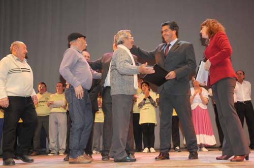Durante la celebración del Día del Jubilado con una Exhibición Gimnástica realizada este jueves en el Complejo Cultural Güido Miranda, la directora Cristina Aboitiz y el gobernador Jorge Capitanich entregaron asistencia a dirigentes de las entidades.