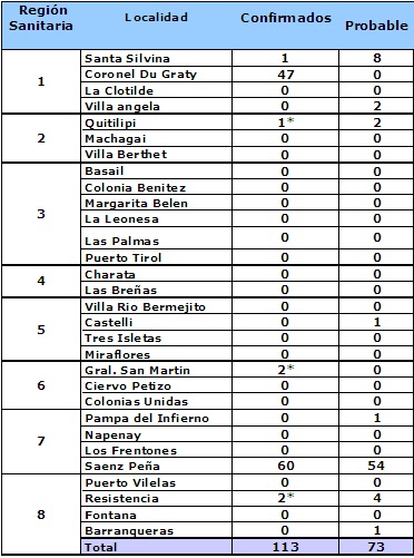 Locales | El Ministerio de Salud Pública informa que se confirmaron 21 casos de dengue en las localidades de Sáenz Peña, Coronel Du Graty y Santa Sylvina a través de los operativos permanentes de búsqueda activa de pacientes febriles y/o personas que presentaron un cuadro febril reciente.