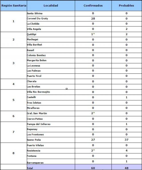 Locales | El Ministerio de Salud Pública informa que se detectaron 22 nuevos casos de dengue en las localidades de Sáenz Peña, Coronel Du Graty y General San Martín, a través de los operativos permanentes de búsqueda activa de pacientes febriles y/o personas que presentaron un cuadro febril reciente.