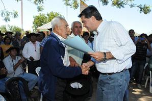 Locales | Al hacer entrega de equipamiento al Municipio de El Espinillo y 36 títulos de propiedad a pequeños productores de la zona, el gobernador Jorge Capitanich brindó precisiones sobre el proyecto de ampliación del acueducto de Castelli, obra que beneficiará con la provisión de agua potable a esta comunidad.