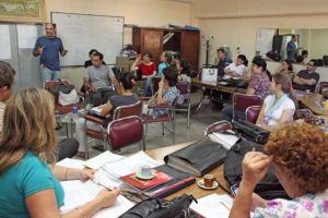 Locales | Con una clase pública con alumnos en el patio continuó la jornada hoy en el Colegio ENS 76 José M. Paz, donde por medio de declaraciones a radio Libertad, los docentes afirmaron que “muchos colegas no recibieron ni un peso del reintegro. De un total de 10 millones de pesos que debían al sector a nivel provincial, se conoció que sólo fue devuelto 2,5 millones”.