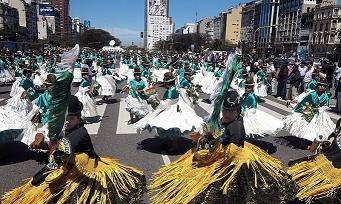 Locales | Unos 12.000 bailarines de la comunidad boliviana hicieron vibrar la avenida 9 de Julio y la Diagonal Norte porteñas, en honor a la Virgen de Copacabana y para celebrar el Día de la Diversidad Cultural Americana.