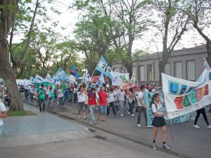 Locales | Más de 200 alumnos de distintos establecimientos educativos de Resistencia y localidades vecinas marcharon por el centro de la ciudad en reclamo de la aprobación de la ley que permitirá la gratuidad del boleto del colectivo urbano e interurbano para los niveles inicial, primario y secundario, y el 50% de descuento para el terciario y universitario.