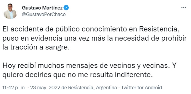 Locales | En su cuenta de Twitter, el Intendente de la ciudad detalló las acciones que está llevando adelante la Municipalidad de Resistencia para eliminar la tracción a sangre e instó al Concejo a acelerar la aprobación del nuevo Código de Tránsito y Transporte.