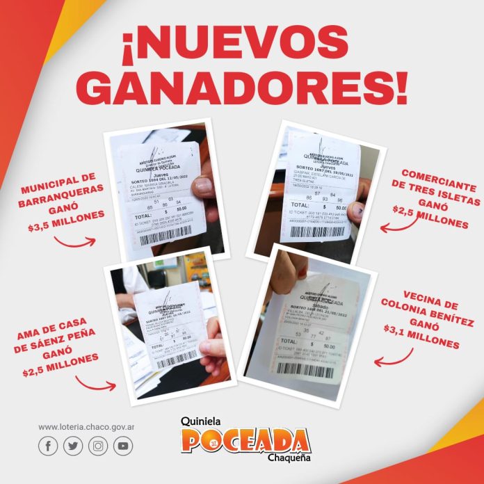 Locales | La Quiniela Poceada Chaqueña sigue repartiendo premios en toda la provincia, esta vez a dos ganadores de Barranqueras y Tres Isletas y otras dos ganadoras oriundas de Presidencia Roque Sáenz Peña y Colonia Benítez.