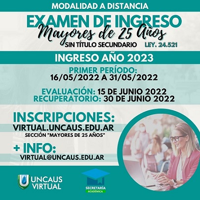 Locales | Se realizará de acuerdo al artículo 7° de la Ley de Educación Superior N° 24.521, donde se establece con carácter de excepción la inscripción a la Universidad para personas mayores de 25 años; argentinos sin título secundario, siempre que, a través de evaluaciones, demuestren que tienen preparación y/o experiencia laboral acordes con los estudios que se proponen encarar, así como aptitudes y conocimientos suficientes para cursarlos satisfactoriamente.