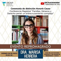 El viernes 6 de mayo, la Universidad Nacional del Chaco Austral (UNCAUS) realizará una ceremonia de entrega de distinción Honoris Causa a la doctora Marisa Herrera quien, además, brindará una Conferencia Magistral.