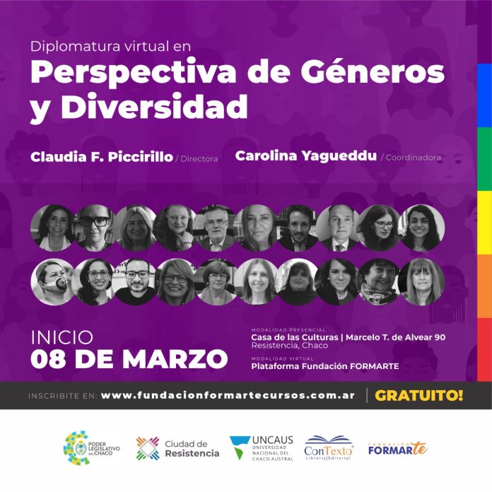 Locales | El próximo 8 de marzo se iniciará la Diplomatura en Perspectiva de Géneros y Diversidad, organizada por la fundación Formarte y con el auspicio de la Cámara de Diputados del Chaco y el Municipio de Resistencia, Uncaus y Editorial Contexto. El primer encuentro será presencial en la Casa de las Culturas, en la esquina de calles Marcelo T. de Alvear y Mitre, a partir de las 17 horas y luego continuará de manera virtual.
