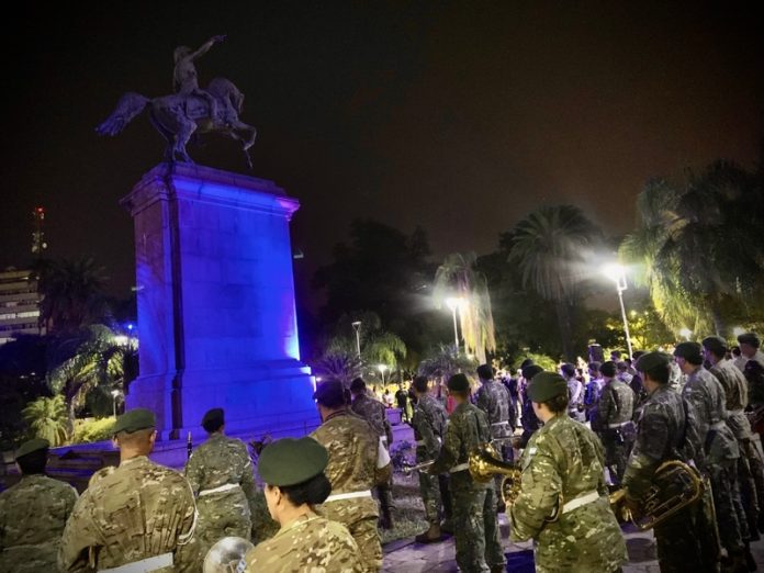 Locales | El intendente Gustavo Martínez encabezó el acto en conmemoración por los 209 años de la Batalla de San Lorenzo, donde se iluminó con los colores celeste y blanco el monumento del General José de San Martín, ubicado en el corazón de la Plaza 25 de Mayo.