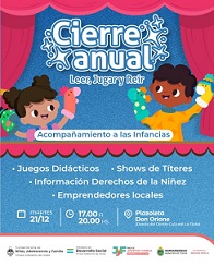 Locales | Este martes, de 17 a 20 en la plazoleta Don Orione, se realizará el cierre anual del programa Leer, Jugar y Reír. Una propuesta que durante el año articuló el área de Juventud y Familia del Municipio, con la Subsecretaría de Niñez, Adolescencia y Familia dependiente del Ministerio de Desarrollo Social, para acompañar a las infancias.