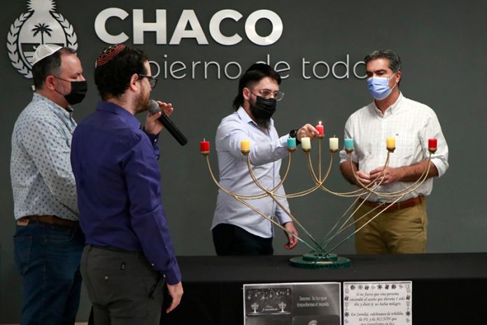 En el hall de Casa de Gobierno, el gobernador Jorge Capitanich y funcionarios provinciales acompañaron a integrantes de la comunidad judía en el marco de los festejos por la Fiesta de las Luminarias, que inició el 28 de noviembre y finaliza el 6 de diciembre. La celebración tiene un significado ligado a la renovación y a la alegría.