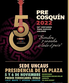 Locales | A través de la Universidad Nacional del Chaco Austral (UNCAus), Pcia. de la Plaza será el próximo 5 y 6 de noviembre, sede del certamen que busca conocer el talento de artistas de todo el país, quienes presentan propuestas folklóricas en música y danzas y les brinda la posibilidad de llegar al Festival Nacional de Folclore Cosquín.