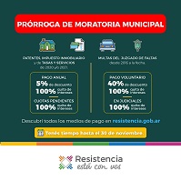 Locales | Resistencia recuerda a los contribuyentes que sigue vigente el régimen especial de facilidades de pago para regularizar deudas municipales, correspondientes a los períodos 2020 y 2021. Esta moratoria también incluye multas contravencionales desde 2016 en adelante.