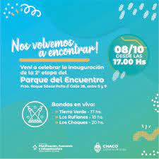Será a partir de las 17 en el Parque del Encuentro donde se inaugurará la segunda etapa que incluyó diversos senderos, juegos y pista de skate, además, de la pavimentación e iluminación de las cuadras circundantes. Habrá actuaciones en vivo de Tierra Verde, Los Rufianes y Los Chaques.