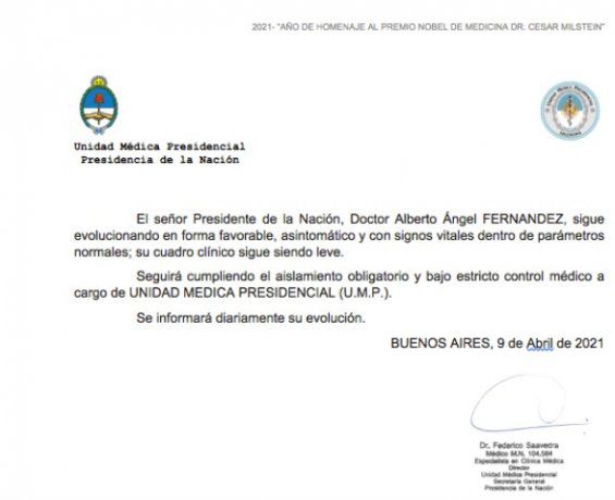 El Presidente "sigue evolucionando en forma favorable, asintomático y con signos vitales dentro de parámetros normales" indica el parte médico y asegura que "su cuadro clínico sigue siendo leve".