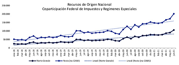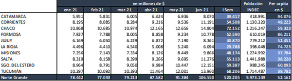 A su vez los ingresos del Norte Grande para el I Semestre 2021 ($ 520.205 millones) son el 34,5 % de los ingresos automáticos totales que fueran distribuidos en concepto de Coparticipación Federal de Impuestos y Regímenes Especiales. Las restantes 13 provincias y la CABA en conjunto percibieron el 65,5% ($ 986.387 millones).