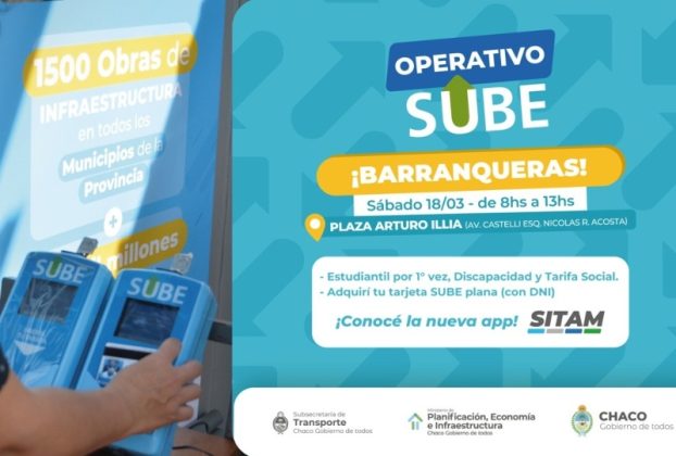 La Subsecretaría de Transporte de la provincia realizará el próximo sábado 18, de 8 a 13, en la Plaza Arturo Illia de Barranqueras un nuevo operativo para que vecinas y vecinos puedan tramitar su credencial SUBE y acceder a las tarifas diferenciadas que se implementan en la provincia.