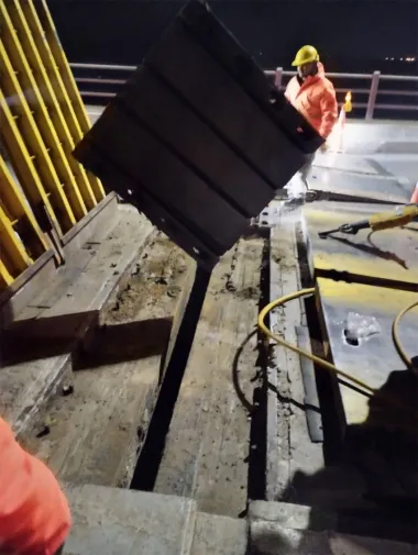 El trabajo implica el cambio de tres juntas tipo Transflex originales de la estructura. Las juntas armadas son módulos de neopreno y acero de 1,10 por 1,00 metro con un peso aproximado de 300 kilogramos cada una.