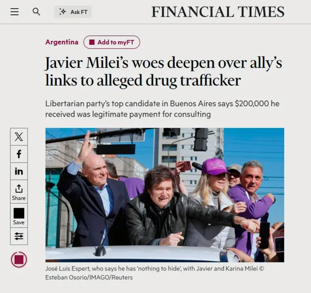 Referencia ineludible para los mercados e inversores de todo el mundo, la publicación británica acaba de publicar un artículo titulado "Se profundizan los problemas de Javier Milei por los vínculos de su aliado con presunto narcotraficante".