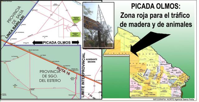 La masa boscosa chaqueña de la zona de Las Pirámides -ubicada a unos 260 kilómetros al noroeste de Roque Sáenz Peña- ha sido considerada zona roja y es, a través de caminos interprovinciales como la Picada Olmos, donde se registran los mayores casos de tráfico ilegal de madera.