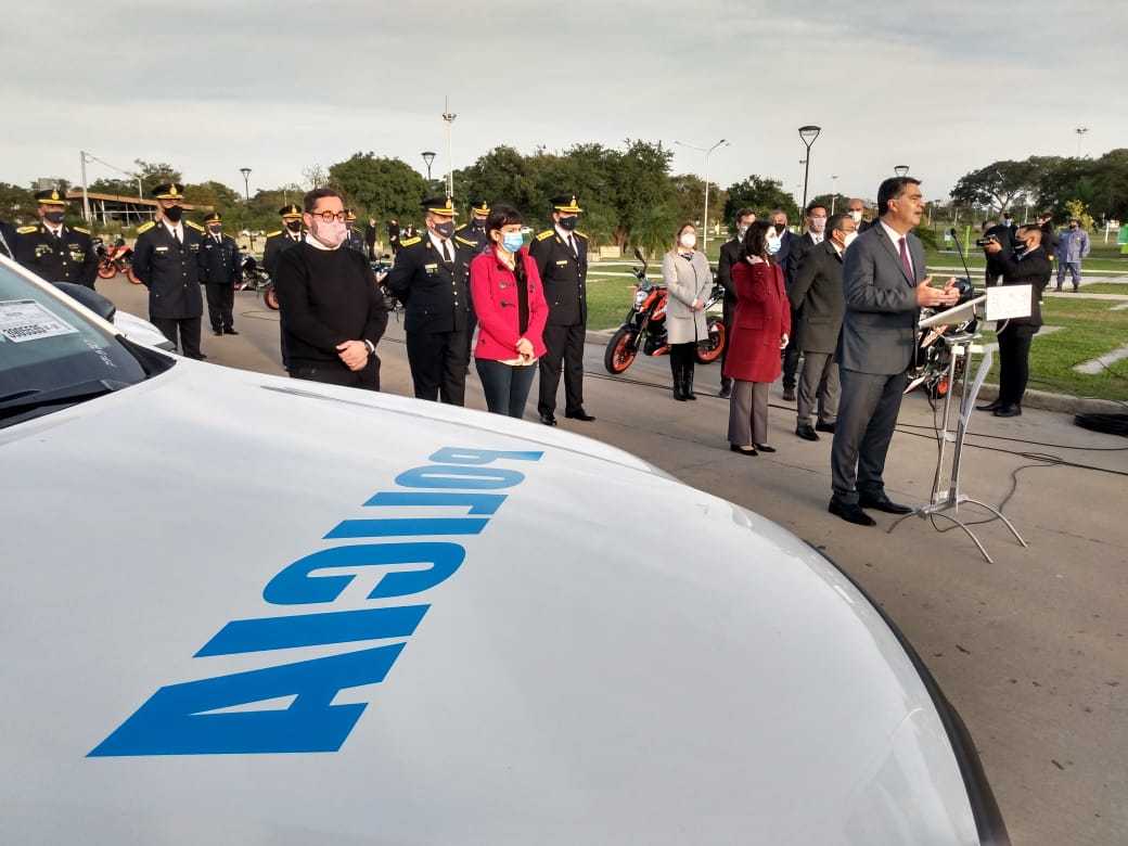 Locales | El gobernador Jorge Capitanich encabezó en la mañana de este martes el acto por la conmemoración del 68 aniversario de la Policía del Chaco, oportunidad en la que entregó oficialmente 119 patrulleros y más de 100 motovehículos. Acompañado de la vicegobernadora, Analía Rach Quiroga, ministros y subsecretarios de su gabinete, y autoridades de la fuerza, el mandatario provincial anunció además el ascenso de 1.100 ascensos y 85 designaciones de ayudantes de policía.