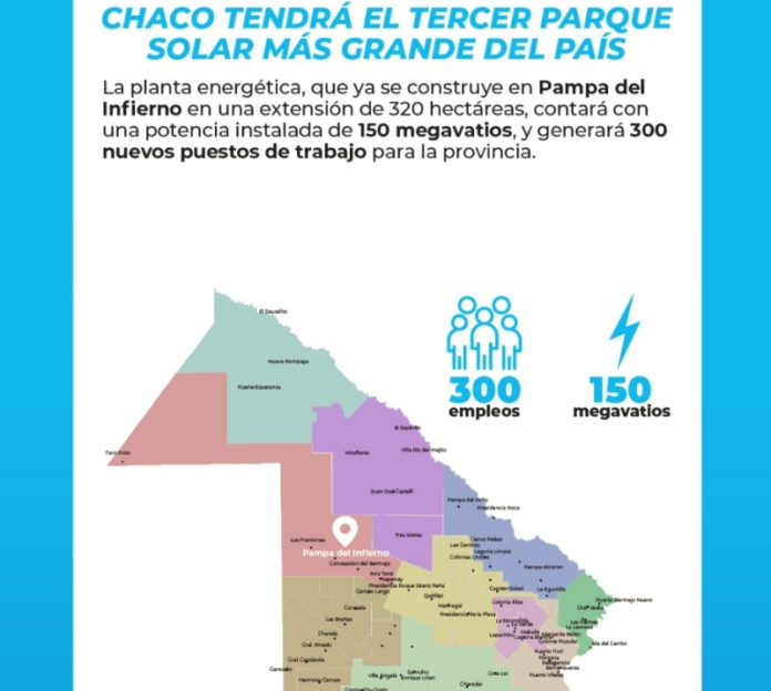 Locales | La planta energética, que ya se construye en Pampa del Infierno en una extensión de 320 hectáreas, contará con una potencia instalada de 150 megavatios, y generará 300 nuevos puestos de trabajo para la provincia. La capacidad energética instalada beneficiará al Chaco y toda la región, reduciendo además la cantidad de dióxido de carbono.