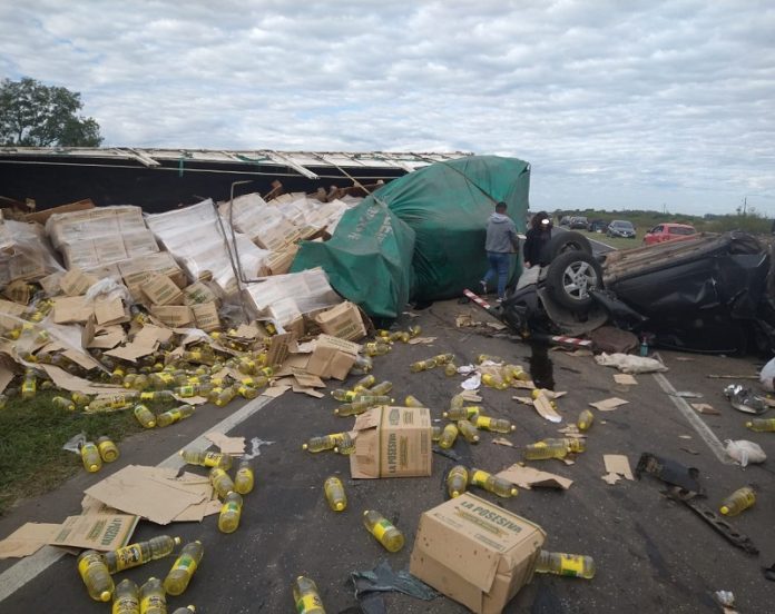 Locales | Un camión que transportaba aceite perdió gran parte de su carga tras chocar contra un auto y volcar sobre la Ruta Nacional 11, a la altura de Margarita Belén.