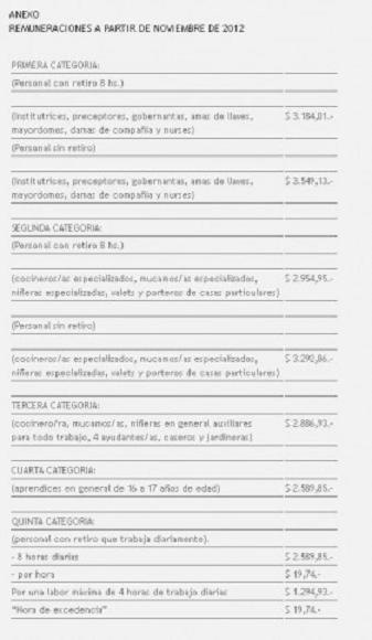 Nacionales | El Ministerio de Trabajo, fijo, por resolución publicada hoy en el Boletín Oficial las remuneraciones mensuales mínimas para trabajadores del servicio doméstico que tendrán vigencia a partir del 1 de noviembre de 2012.