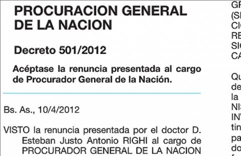 Nacionales | La presidenta Cristina Fernández de Kirchner aceptó la renuncia presentada por Esteban Justo Antonio Righi al cargo de Procurador General de la Nación. Así lo establece el decreto 501/2012 publicado en el Boletín Oficial y que en su artículo 2 agradecen al funcionario.