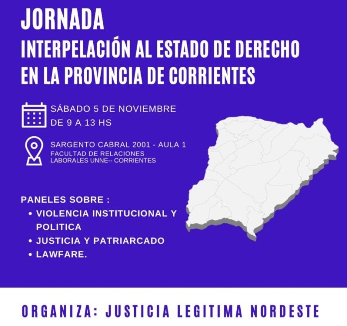 Locales | Organizada por la Asociación Justicia Legítima Regional Nordeste, el próximo sábado 5 de noviembre se llevará a cabo la Jornada “Interpelación al Estado de Derecho en Corrientes”. Será de 9 a 13, en el Aula Magna de la Facultad de Relaciones Laborales -ubicada en Sargento Cabral 2001- de la ciudad de Corrientes. El cierre estará a cargo de la presidenta de Justicia Legítima, Cristina Caamaño.