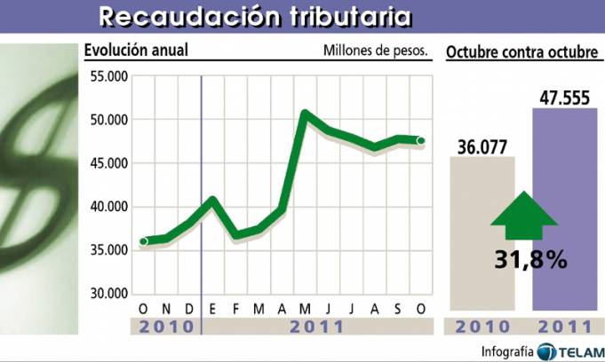 Nacionales | La recaudación tributaria de octubre alcanzó a 47.554,9 millones de pesos, un 31,8% más que en igual mes del 2010, impulsado por los mayores ingresos relacionados al comercio exterior, el impuesto a las ganancias, y los impuestos a los combustibles, se anunció oficialmente.