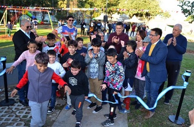 Locales | El intendente Gustavo Martínez encabezó la reinauguración de una plazoleta ubicada en el barrio Malvinas, en Santa María de Oro al 2350. Las obras incluyeron nuevas sendas peatonales, sectores de estar con losetas y bancos, instalación de equipamiento urbano, juegos, ejercitadores, cestos de residuos, cartelería y nuevas columnas de alumbrado.