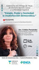 Cristina Fernández de Kirchner brindará la Conferencia Magistral: “Estado, Poder y Sociedad: la Insatisfacción Democrática”, en la entrega de Título de Doctora Honoris Causa de UNCAUS.