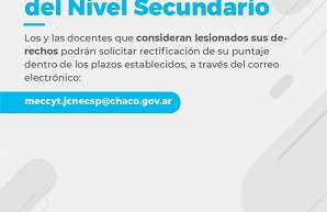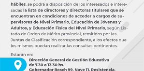 Locales | El Ministerio de Educación del Chaco, a través de la Junta de Clasificación del Nivel Secundario de las regionales 1, 2, 3, 4, 8 y 9 -sede Sáenz Peña- comunica que a partir del lunes 25 de abril y por 10 días hábiles se llevará a cabo el período de tachas para el llamado a designación de cargos de supervisores interinos y/o suplentes de: