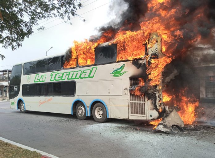 Locales | El siniestro que sólo tuvo consecuencias materiales, según informó la Policía, se produjo antes de las 9 de la mañana cuando la fuerza fue alertada por el servicio de Emergencia 911 que en Av. Mac Lean y calle Tejedor se estaba produciendo el incendio de un colectivo, y por ello partió al lugar una dotación de Bomberos a cargo del oficial Ayudante Nelson Monfardini.