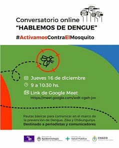 Locales | Este jueves de 9 a 10.30 a través de la plataforma Google Meet. Disertarán profesionales de la salud encabezados por la directora de Epidemiología María Elisa Flores. El objetivo es socializar las buenas prácticas en la difusión de la información referida a las enfermedades de transmisión vectorial.