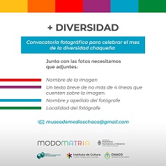 Locales | La revista ModoMatria, publicación de la Secretaría de Derechos Humanos y Géneros de la Provincia, y el Museo de Medios de Comunicación Raúl Delfino Berneri lanzaron una convocatoria fotográfica para celebrar el Mes de la Diversidad chaqueña.