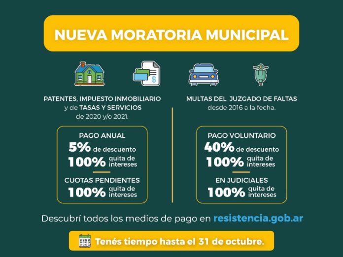 Hasta este domingo 31 de octubre seguirá vigente en Resistencia el régimen especial de facilidades de pago para regularizar deudas municipales y multas, correspondientes a los períodos 2020 y 2021, con importantes descuentos y quita de intereses. Vale recordar que quienes realicen el pago anual tendrán la quita del total de los intereses y también se les otorgará un 5% de descuento.