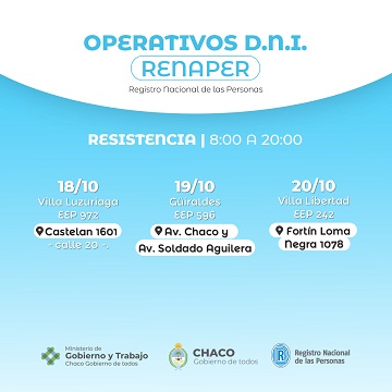 Los operativos se desarrollarán, del 17 al 26 de octubre, operativos en Resistencia, Colonia Aborigen, Puerto Tirol y Barranqueras. Se tramitarán DNI, Pasaporte y CPI (Certificado de Pre identificación).